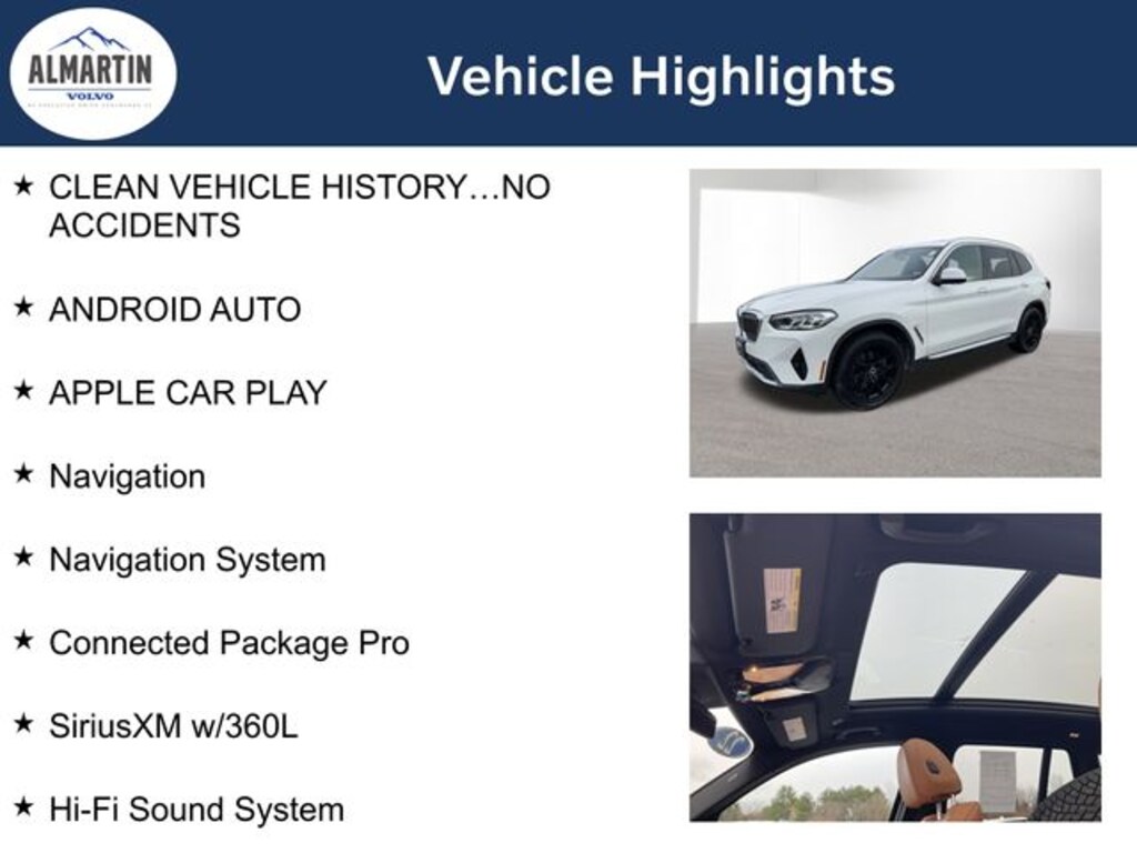 2022 BMW X3, CLEAN VEHICLE HISTORY...NO ACCIDENTS, ANDROID AUTO, APPLE CAR PLAY, 8-Speed Automatic Sport, 4-Wheel Disc Brakes, ABS brakes, Air Conditioning, AM/FM Radio, Apple CarPlay & Android Auto Compatibility, Auto High-beam Headlights, Automatic temperature control, BMW Assist eCall, BMW TeleServices, Comfort Access Keyless Entry, Connected Package Pro, ConnectedDrive Services, Delay-off headlights, Dual front impact airbags, Dual front side impact airbags, Electronic Stability Control, Emergency communication system: BMW Assist eCall, Enhanced Bluetooth, Exterior Parking Camera Rear, Four wheel independent suspension, Front anti-roll bar, Front Bucket Seats, Fully automatic headlights, Garage door transmitter, Genuine wood dashboard insert, Genuine wood door panel insert, Heated Front Seats, Hi-Fi Sound System, Knee airbag, Low tire pressure warning, Memory seat, Navigation, Navigation System, Occupant sensing airbag, Overhead airbag, Panoramic Moonroof, Power driver seat, Power passenger seat, Power windows, Rain sensing wipers, Rear air conditioning, Rear anti-roll bar, Rear window defroster, Remote Engine Start, Security system, SiriusXM w/360L, Split folding rear seat, Steering wheel mounted audio controls, Traction control, Wheels: 19" x 7.5" Y-Spoke (Style 693), WiFi Hotspot.
