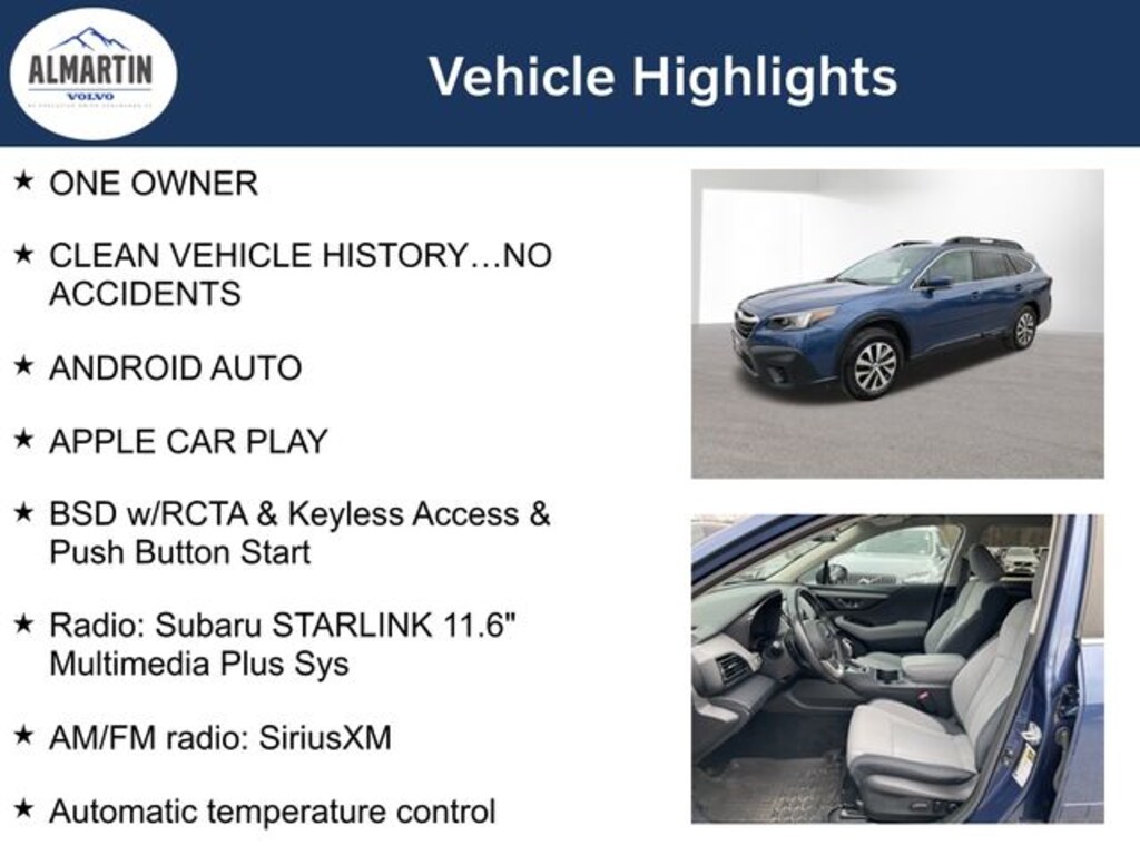 2022 Subaru Outback, ONE OWNER, CLEAN VEHICLE HISTORY...NO ACCIDENTS, ANDROID AUTO, APPLE CAR PLAY, 4-Wheel Disc Brakes, ABS brakes, Air Conditioning, AM/FM radio: SiriusXM, Automatic temperature control, Blind Spot Detection (BSD), BSD w/RCTA & Keyless Access & Push Button Start, Bumpers: body-color, Cloth Upholstery, Dual front impact airbags, Dual front side impact airbags, Electronic Stability Control, Emergency communication system: STARLINK Safety and Security (Subscription Required), Exterior Parking Camera Rear, Front anti-roll bar, Front Bucket Seats, Front dual zone A/C, Front fog lights, Hands-Free Power Rear Gate, Heated door mirrors, Heated Front Bucket Seats, Heated front seats, Illuminated entry, Keyless Access w/Push Button Start, Knee airbag, Low tire pressure warning, Occupant sensing airbag, Overhead airbag, Power door mirrors, Power steering, Radio: Subaru STARLINK 11.6" Multimedia Plus Sys, Rear anti-roll bar, Rear Cross Traffic Alert (RCTA), Remote keyless entry, Spoiler, Steering Wheel Paddle Shift Control Switches, Turn signal indicator mirrors, Wheels: 17" x 7J Black Aluminum Alloy.