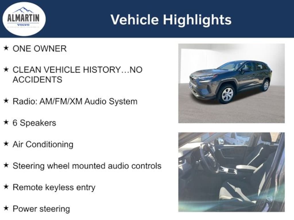 2023 Toyota RAV4, ONE OWNER, CLEAN VEHICLE HISTORY...NO ACCIDENTS, AWD, Black Cloth, 17" Steel Wheels, 4-Wheel Disc Brakes, 6 Speakers, ABS brakes, Air Conditioning, Bumpers: body-color, Driver door bin, Dual front impact airbags, Dual front side impact airbags, Electronic Stability Control, Emergency communication system: Safety Connect (10-year trial), Fabric Seat Trim, Four wheel independent suspension, Front anti-roll bar, Front Center Armrest, Illuminated entry, Knee airbag, Low tire pressure warning, Occupant sensing airbag, Overhead airbag, Overhead console, Power steering, Radio: AM/FM/XM Audio System, Rear anti-roll bar, Rear seat center armrest, Remote keyless entry, Speed-sensing steering, Split folding rear seat, Spoiler, Steering wheel mounted audio controls, Tilt steering wheel, Traction control.